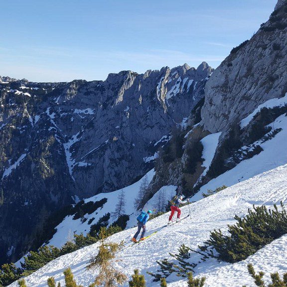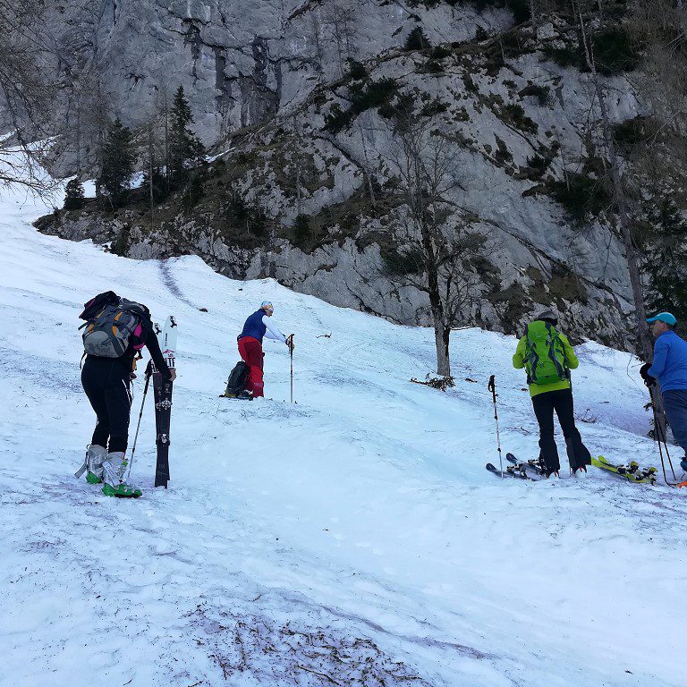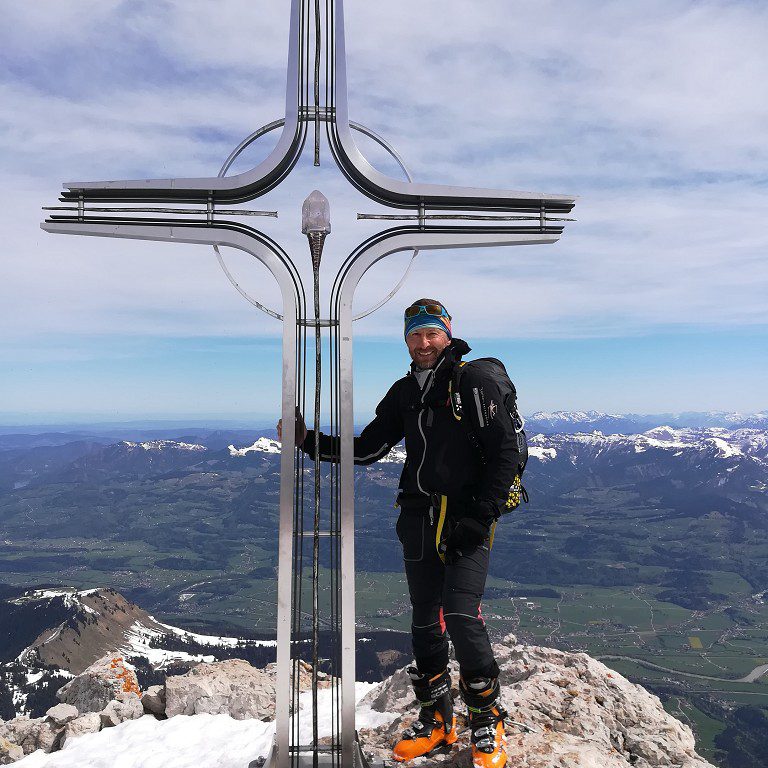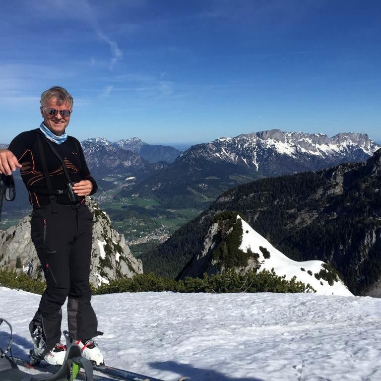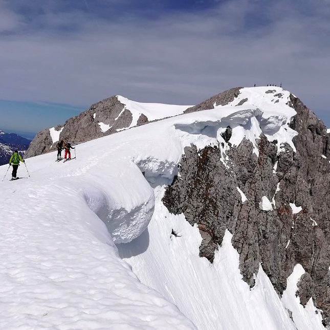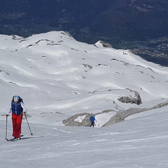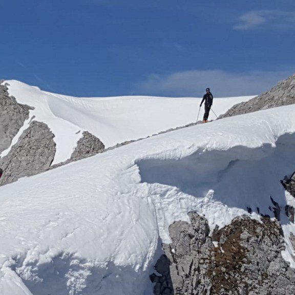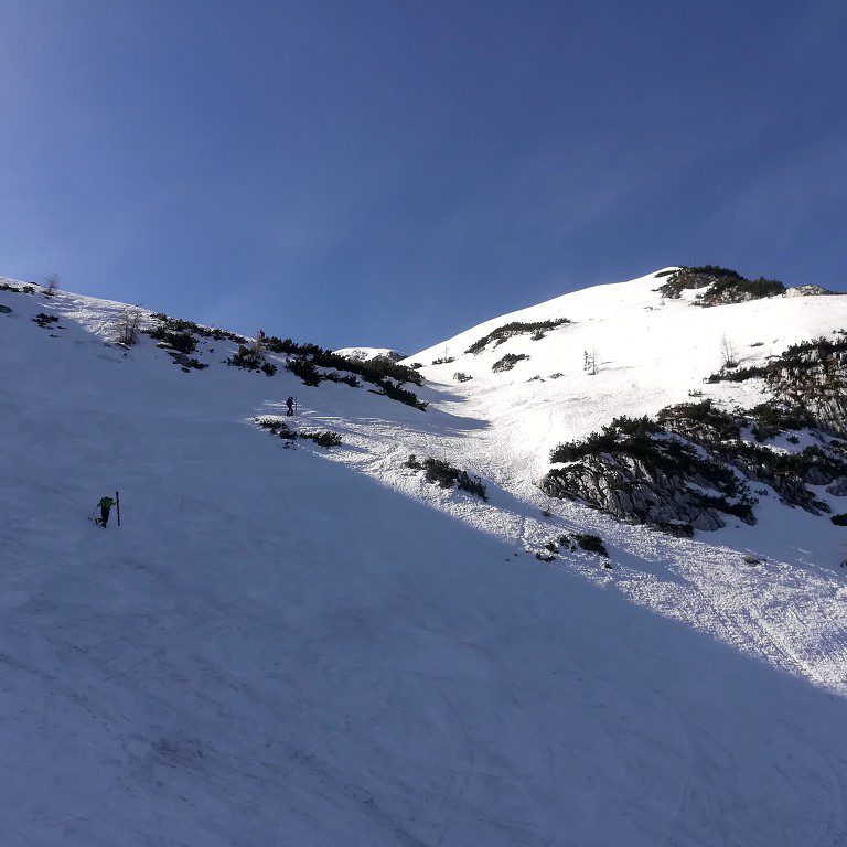 Da Göll is 2523 m hoch und da liegt no gnua Schnee für a Skitour. Natürlich is da Weg da nauf nimma so wia im Hochwinter. Man muas de Ski vom Beginn vom Alpetalsteig weg a weng drang. Aber was macht des scho eigfleischte Tourengeher? Ski auf’n Rucksack, Rucksack auf’n Buckl und los. Nach a hoibn Stund war Schneekontakt und nach ca. 1 3/4 Stund war de erste Rast in da Sonn. S’Weda war traumhaft, leichte Brise und blaua Himme. An da Steilstufn in da Mittn von da Tour war moi kurz Harscheisen-testen ogsagt. Ois had basst und nach ca. 4 Stund und 1400 hm war da Gipfe erreicht.