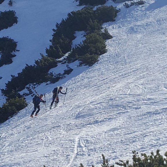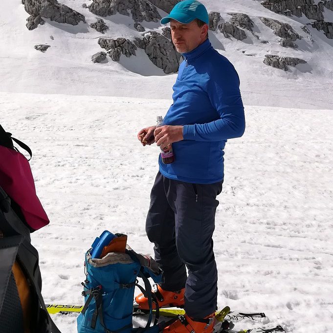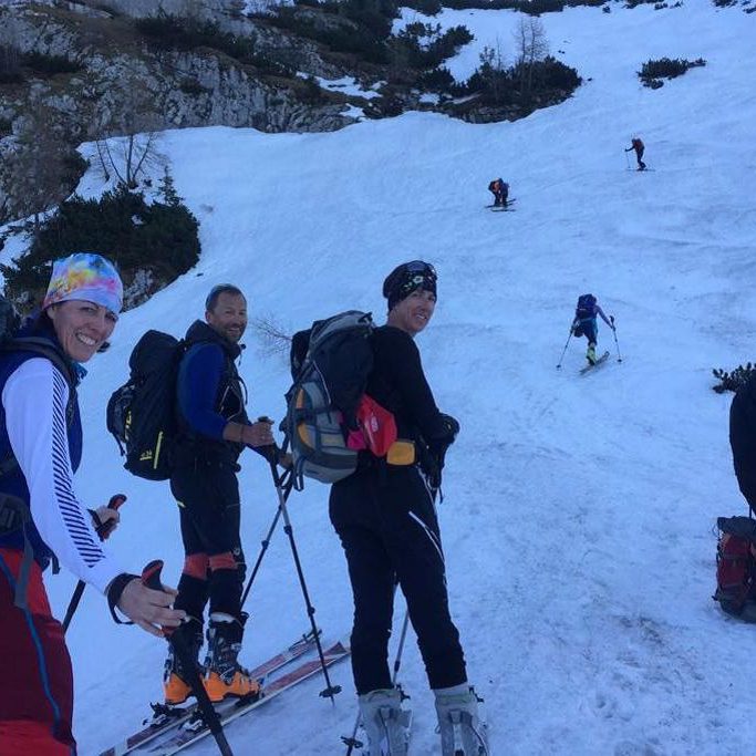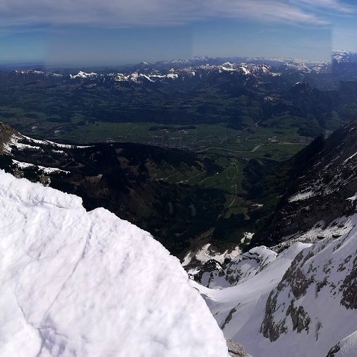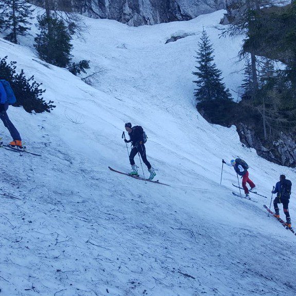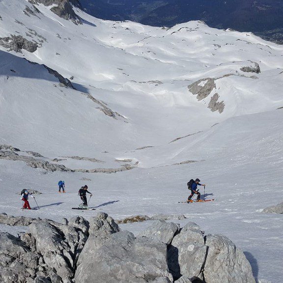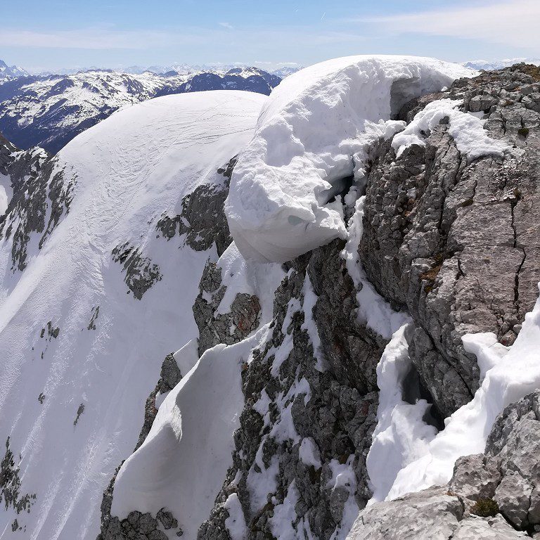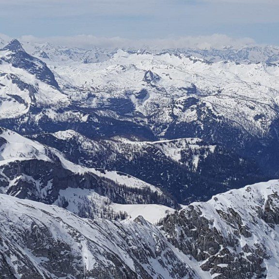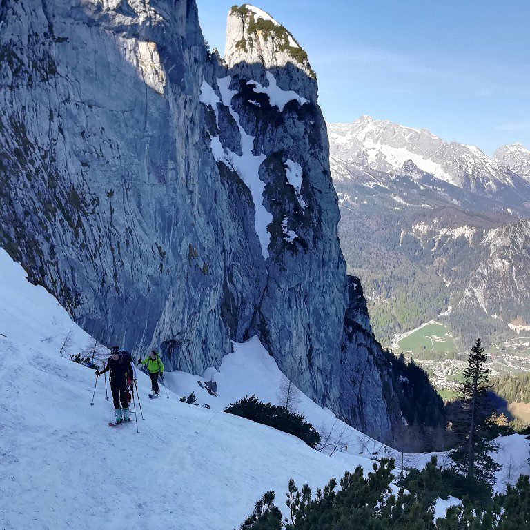 Da Göll is 2523 m hoch und da liegt no gnua Schnee für a Skitour. Natürlich is da Weg da nauf nimma so wia im Hochwinter. Man muas de Ski vom Beginn vom Alpetalsteig weg a weng drang. Aber was macht des scho eigfleischte Tourengeher? Ski auf’n Rucksack, Rucksack auf’n Buckl und los. Nach a hoibn Stund war Schneekontakt und nach ca. 1 3/4 Stund war de erste Rast in da Sonn. S’Weda war traumhaft, leichte Brise und blaua Himme. An da Steilstufn in da Mittn von da Tour war moi kurz Harscheisen-testen ogsagt. Ois had basst und nach ca. 4 Stund und 1400 hm war da Gipfe erreicht.