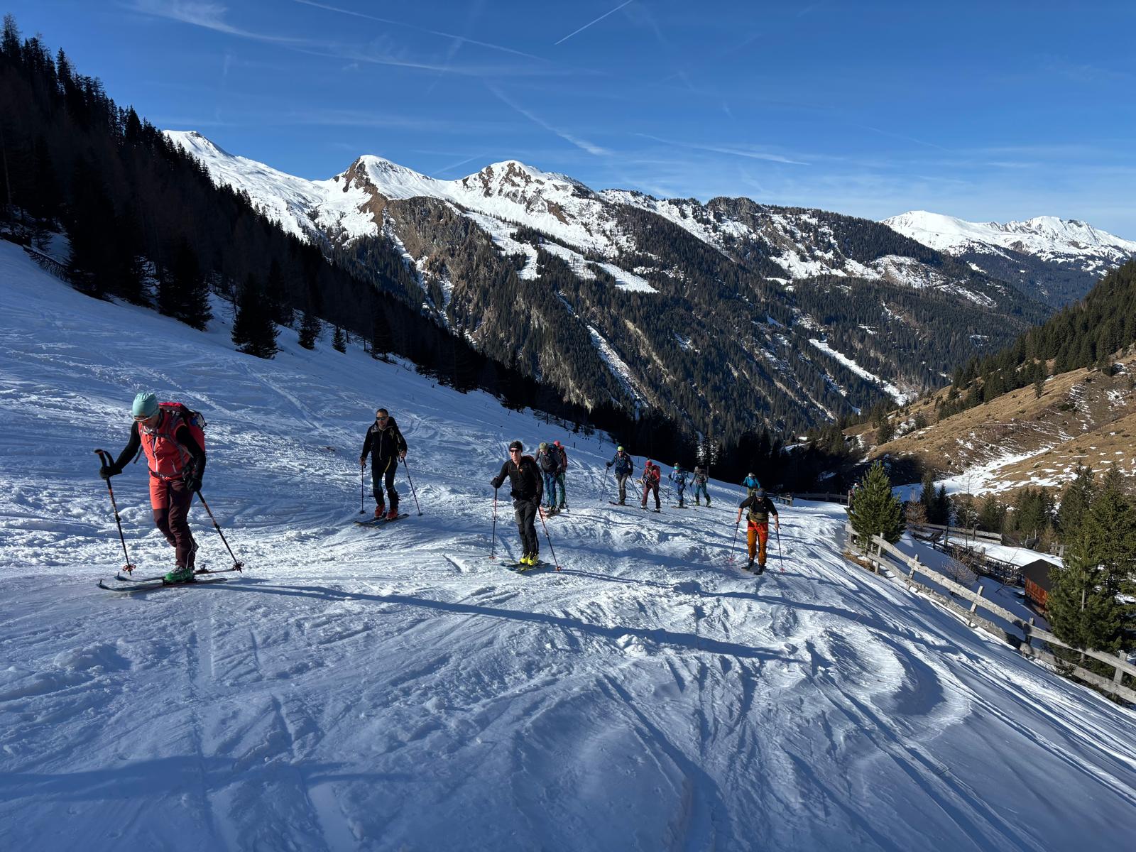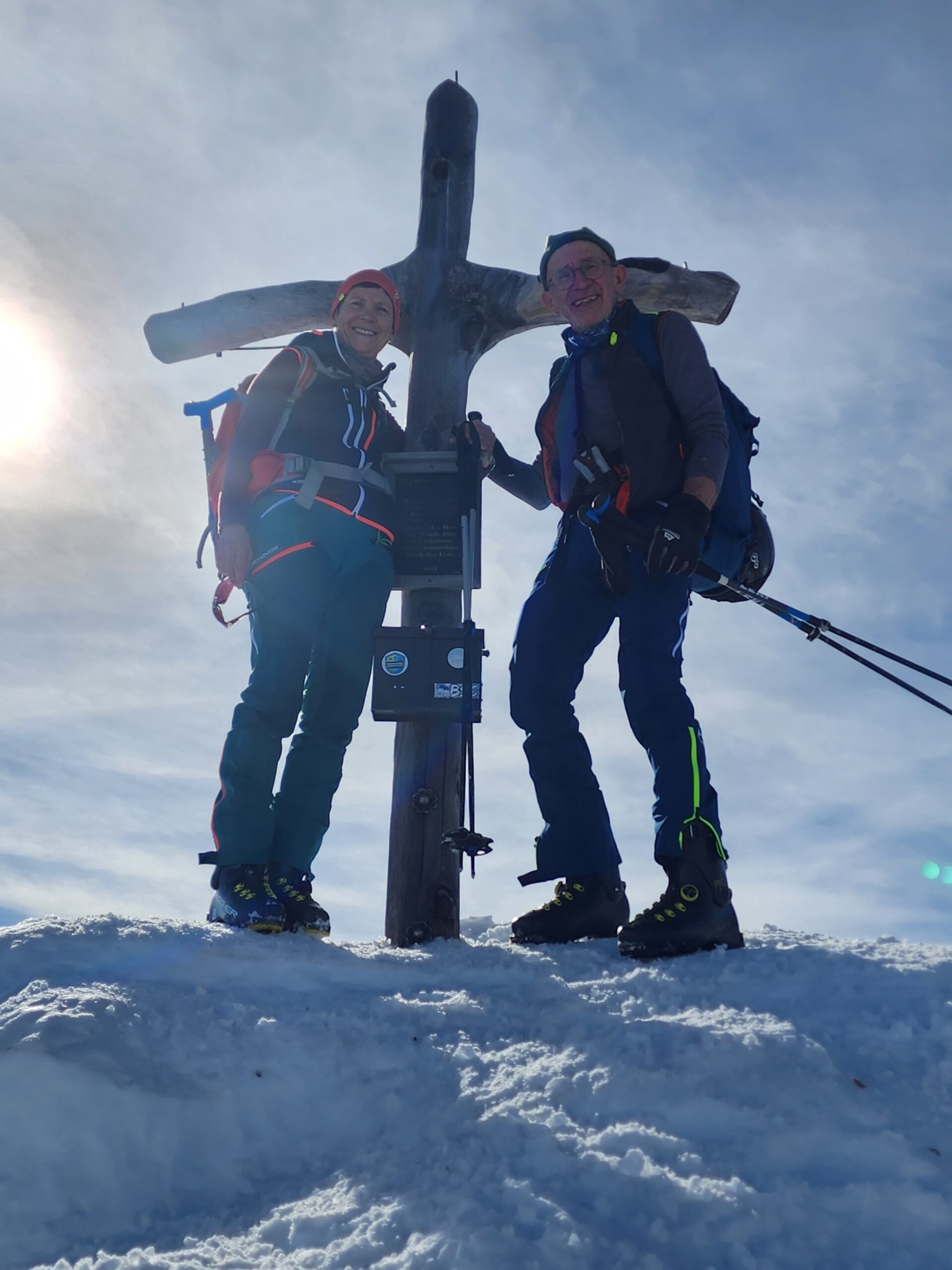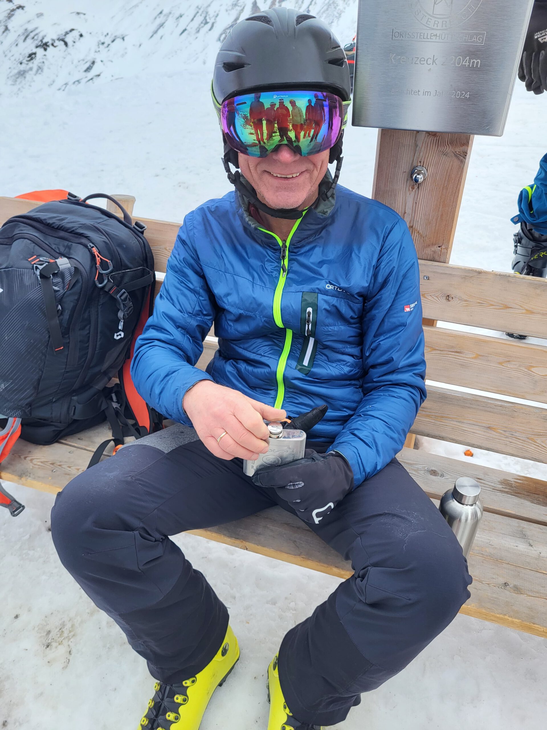 Am Samstag stand die Königstour zum 2475 Meter hohen Schöderhorn, ausgehend vom Talwirt am Talschluss, an. Die ersten 300 Höhenmeter auf der Forststraße waren geprägt von häufigen Tragepassagen an den aperen Stellen, bis kurz vor der Kreealmkapelle. Ab hier bot sich den Bergfreunden ein traumhaftes Skitourengelände mit stahlblauem Himmel, ungetrübter Sonnenschein und Bilderbuchpanorama. Heute sorgte Tourenführer Franz Kinnigkeit für das ökonomische Tempo mit gut getimten Pausen um alle Teilnehmer auf den Gipfel zu führen. Sepp Lurz motivierte am Ende des Feldes. Nach knapp fünf Stunden erreichten alle zwölf Skitourenfreunde den großartigen Gipfel mit dem spartanischen Gipfelkreuz und dem grandiosen Rundblick durch die Hohen Tauern. Bevor man die Abfahrt startete gab´s noch Gipfel-Selfies und ein kleine Brotzeit. Die Erfahrung von Franz beschied der Gruppe auch noch einige Hänge mit feinstem Pulver, der weiter unten zwar einen Stich hatte aber noch gut fahrbar war. Die abschließende Tragepassage tat der heutigen Genusstour keinen Abbruch, wissentlich der belohnenden Einkehr beim Talwirt am Parkplatz. Bei Brotzeit, Kaffee und Kuchen, ließ man das Erlebte an Hand der Fotos sowie der persönlichen Eindrücke Revue passieren.