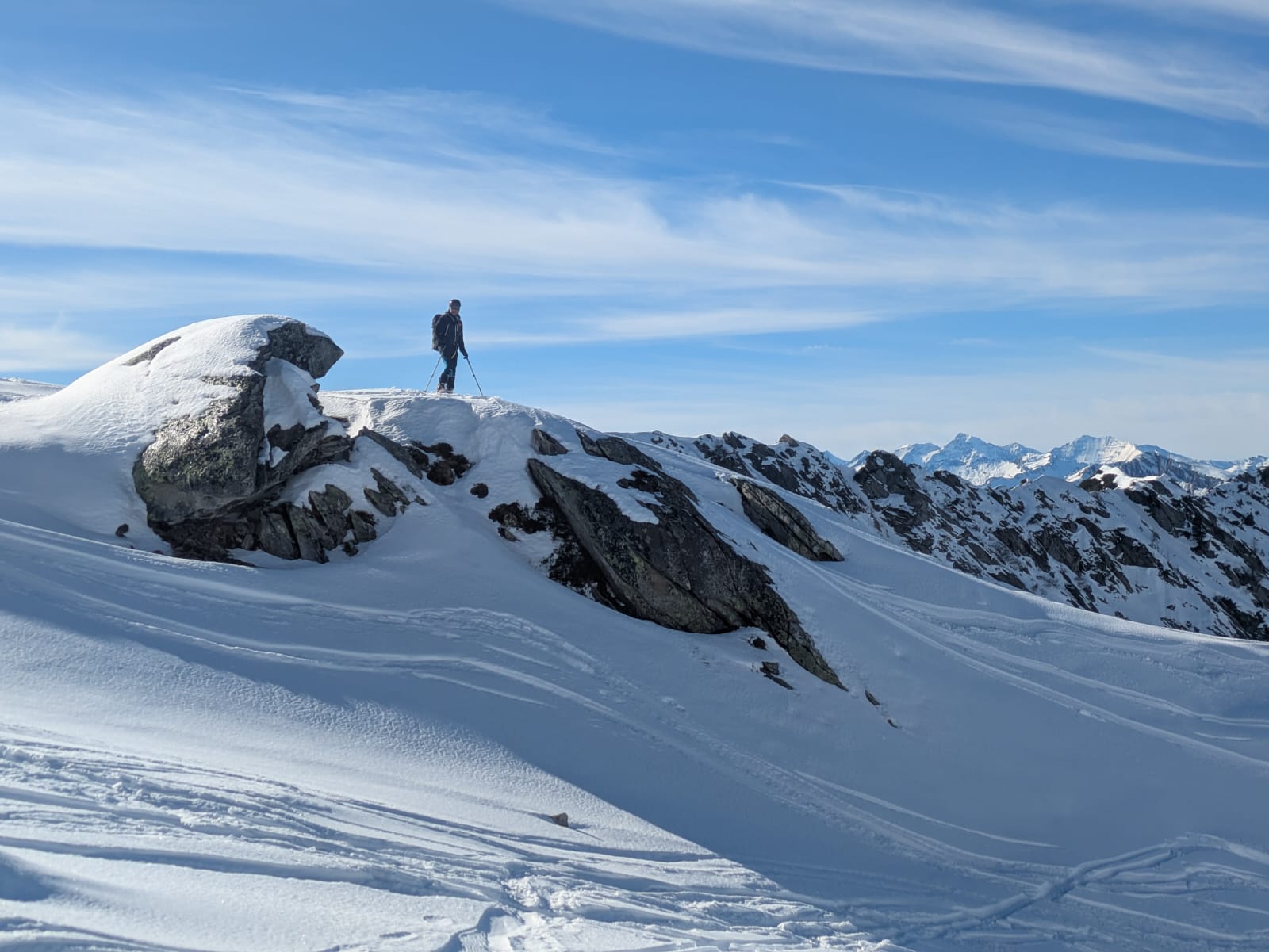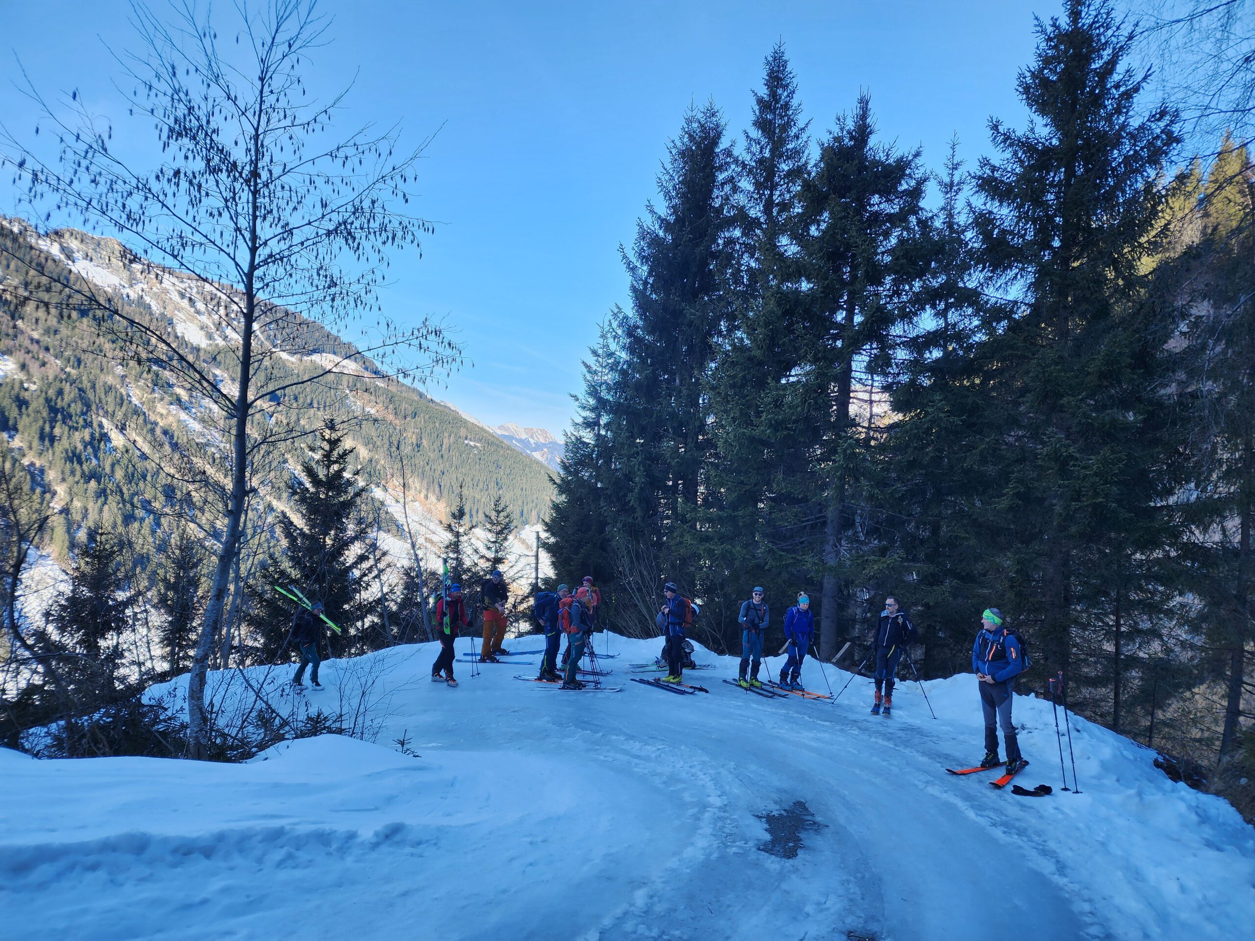 Zum Einstieg wurde das 2189 Meter hohe Filzmooshörndl mit 850 zu bewältigenden Höhenmetern und 12 Entfernungskilometern angegangen. Auf Grund der Anfahrt und der für Samstag geplanten 1450 Höhenmetertour war die Warm-Up Tour genau richtig. Als Route, ausgehend von der Ellmaualm, hatte man anfangs die Forststraße durch den romantisch lichten Lärchenwald gewählt. Der Sonne – Schattenwechsel bereitete dem ein oder anderen ein wenig Schwierigkeiten mit dem anstollenden Schnee an den Fellen. Mit dem Einsatz von Imprägnierwachs war aber schnell Abhilfe geschafft. Es ging zügig voran und nach drei Stunden wurde das Skidepot mit dem Gipfel erreicht. Trotz vieler Spuren fand Sepp mit dem Gespür für Schnee noch ein paar freie Hänge, in die man schöne Spuren legen konnte. Die letzten Kilometer wedelte die Gruppe auf der pistenähnlichen Forststraße zu den Autos, wo die Rosi selbstgemachten Eierlikör in Waffelbechern servierte.