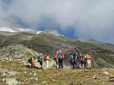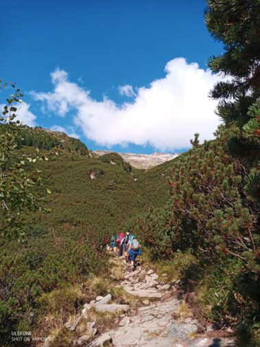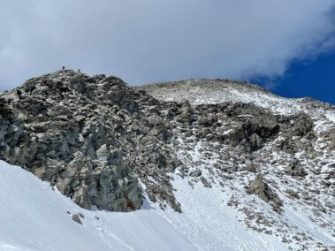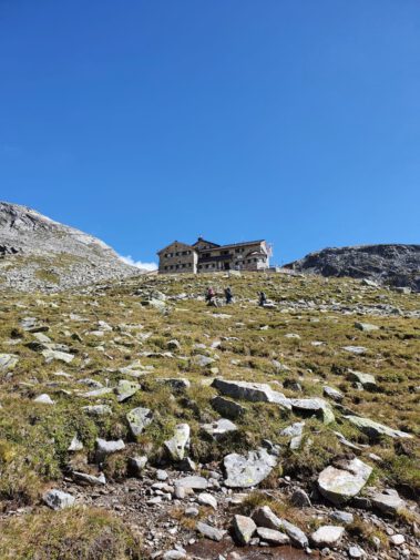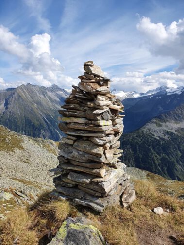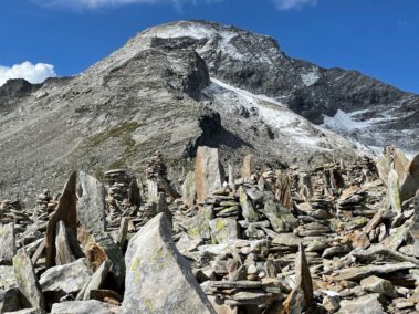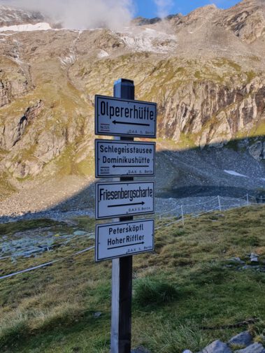 Zur Mittagszeit erreichte man die Hütte, bezog die Zimmer-Lager und stärkte sich mit Suppen oder Kaspressknödel für die weiteren Unternehmungen am Nachmittag. Einige Wanderer bestiegen den Hausberg, das 2677 Meter hohe Petersköpfel mit seinen tausend Stoanmandln und spazierten auf dem Berliner Höhenweg zum Wesendlkarsee. Der Großteil versuchte sich mit leichtem Rucksack am 3231 Meter Hohen Riffler. Bei guten Verhältnissen ist dieses Unterfangen für Trittsichere und Schwindelfreie gut machbar, wobei 1500 Höhenmeter Gesamtaufstieg eine gute Kondition voraussetzen. Da es einige Tage vor der Tour bis 2500 Meter runter schneite, hatten die Bergsteiger mit rutschiger Blockkletterei zu kämpfen, was nicht ohne die ein oder andere Schramme an den Schienbeinen abging. Ein Teil der Wagemutigen änderte das Ziel und war mit der Überschreitung der Dreitausendergrenze zufrieden. Drei Frauen und drei Männer erreichten schließlich bei fast windstillen Verhältnissen und toller Fernsicht den Gipfel. Zum Abstieg war noch einmal höchste Konzentration angesagt.