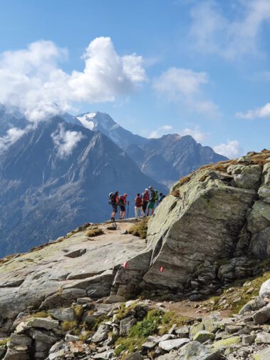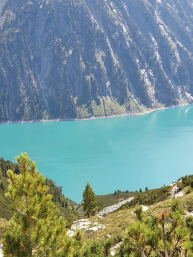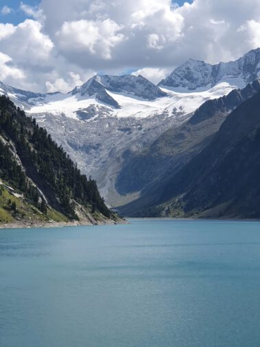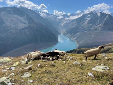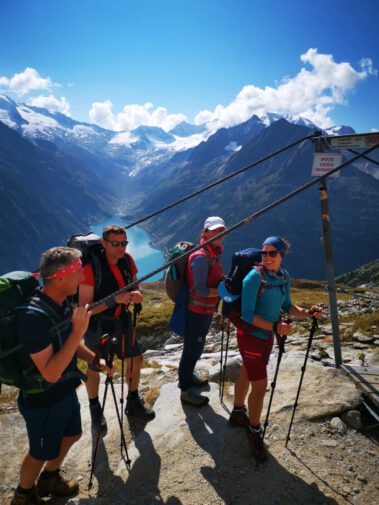 Nach einem schmackhaften Abendessen und gemütlichen Hüttenabend ging es am Sonntag auf dem Berliner Höhenweg zur zweieinhalb Stunden entfernten Olperer Hütte. Dieser Abschnitt war der wohl schönste Teil des Wanderwochenendes. Wie auf einem Balkon wanderte man über dem Türkisblauen Schlegeisspeicher, bei bestem Bergwetter, vorbei an Schafherden und dem ständigen Panorama der Schlegeiskees-Gletschers, umrahmt von den Dreitausendern Olperer, Großer Möseler, Hochfeiler, Dreiherrnspitze und viele mehr.