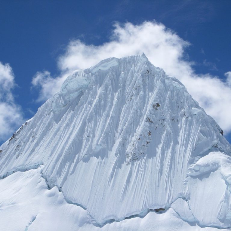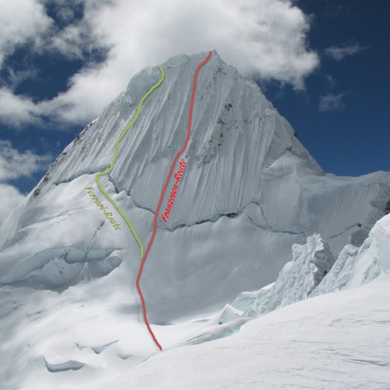 Der Alpamayo verfehlt zwar mit seinen 5.947 Höhe knapp die 6000er Marke, wurde jedoch schon mehrmals zum schönsten Berg der Erde gekürt. Die bis zu 80 Grad steile Franzosen-Route, an dieser bei stahlblauen Himmel herrlich weißen Pyramide, fordert den routinierten Eisgeher voll und ganz. Auch der Tiefblick vom Gipfel ist nichts für schwindelanfällige Bergwanderer. Die objektiven Gefahren von Spinndrift und Eisschlag machen diese Tour zu einem gefährlichen Unterfangen.