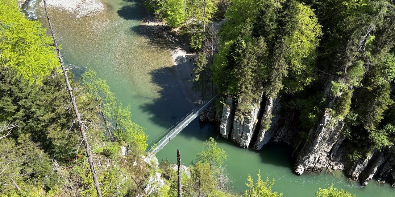 Am Ziel erwarten uns zwei Hängebrücken und eine Panoramakanzel, die einen herrlichen Ausblick auf die bizarren Felsenwände der Klobensteinschlucht ermöglichen. Es gibt einen Brotzeitplatz sowie ein Gasthaus. Die Kiesbänke der türkisfarbenen Tiroler Ache laden zu einem Fußbad ein. Hier ist eine Stunde Aufenthalt geplant. Wer möchte kann die Tour zu einer weiteren Aussichtskanzel erweitern oder die Wallfahrtskirche Maria Klobenstein besichtigen.