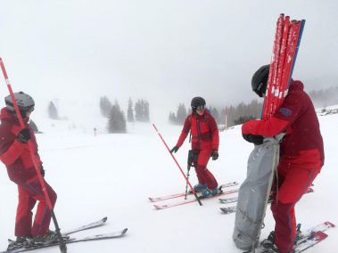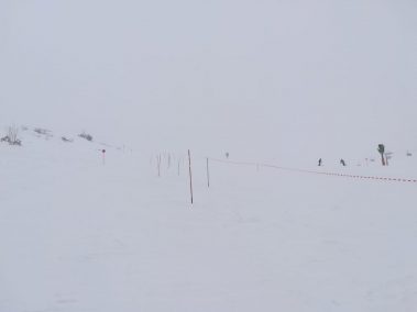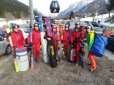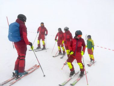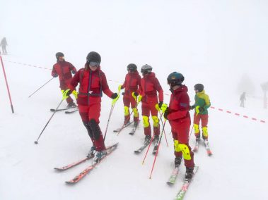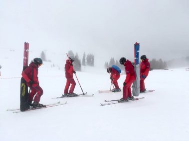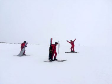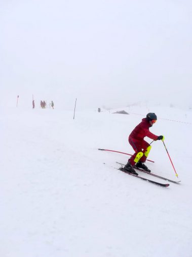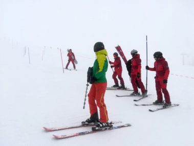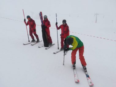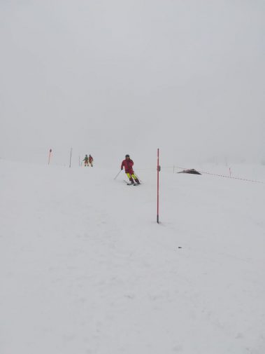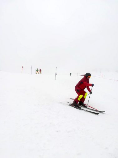 Am Vormittag mussten sich die sieben motivierten Skilehrer noch bei Nebel und Schneefall den Weg durch die Stangen suchen. Dafür wurde zusammen ein Slalom gesteckt und danach die notwendige Technik geübt und verinnerlicht. Gekleidet in der neuen Slalomausrüstung wurde man von Fahrt zu Fahrt mutiger und sicherer.