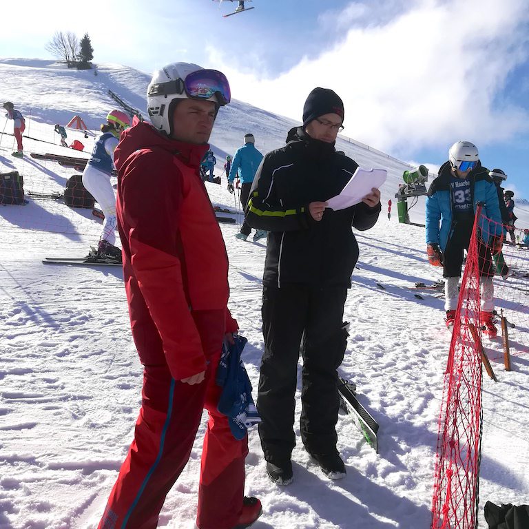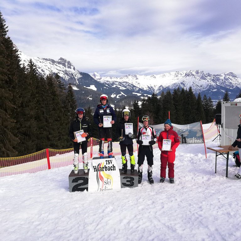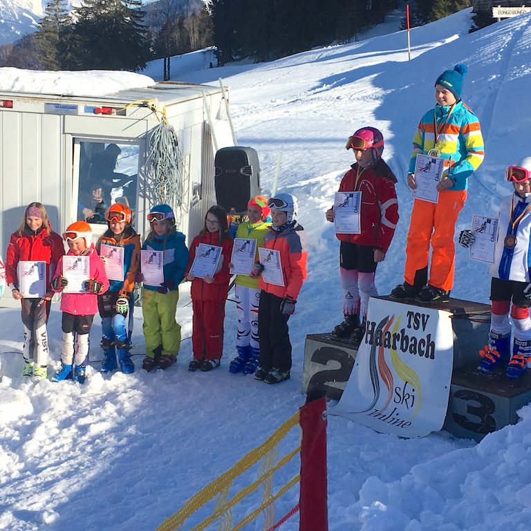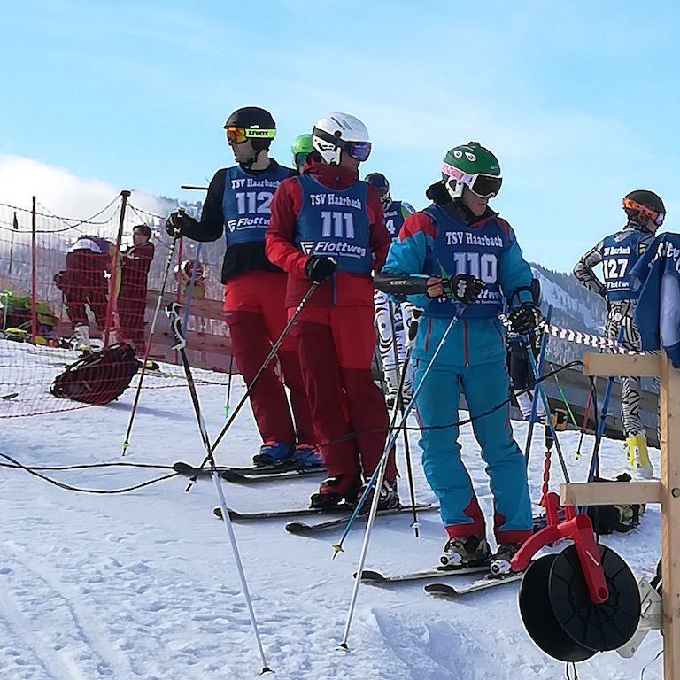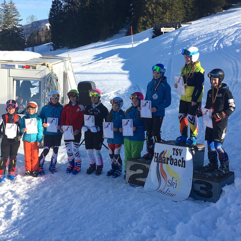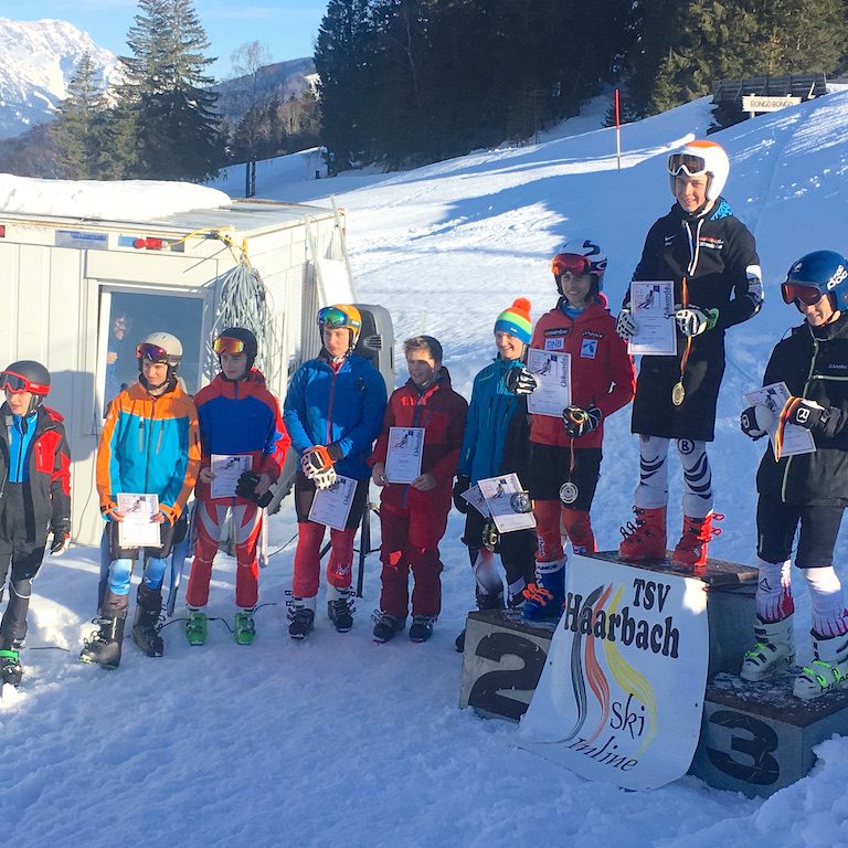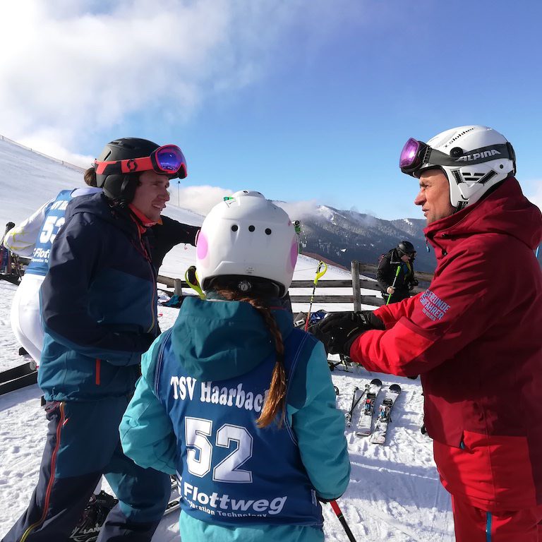 Am Freitag bereitete Dauerregen dem Aufbauteam des TSV Haarbach noch sorgen. Am Samstag – dem Renntag – war die Piste dann steinhart gefroren und in einwandfreiem Zustand, allerdings auch eine Herausforderung für die Rennläufer! Betreut wurde unsere Rennmannschaft diesmal von Passi Schreiber. Bei der Laufbesichtigung und vor dem Start gab er wertvolle Tips! Bei strahlendem Sonnenschein konnte der aus 35 Toren bestehende Riesenslalom pünktlich gestartet werden und ging reibungslos über die Bühne. Der zweite Lauf folgte im Anschluss nach einer Pause, da umgesteckt werden musste! Nach einer weiteren Besichtigung ging es dann zügig wieder weiter!