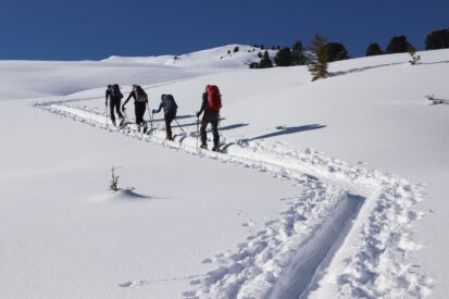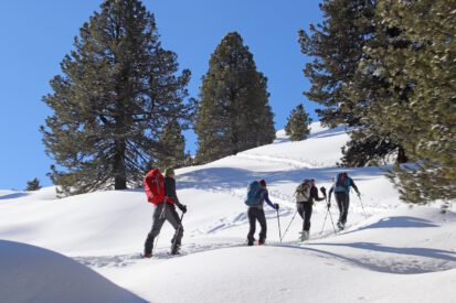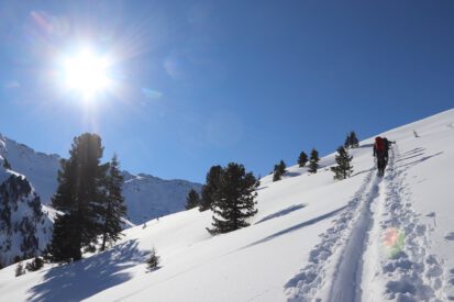 Ziel sollte der Bärentalkopf im Langen Grund, ein wenig beachteter Nebengipfel der prominenteren Pallspitze sein. Bei Insidern ist der 2186m hohe Gipfel wegen seiner freien Abfahrthänge im XXL-Format eine der schönsten Skitouren der Kitzbüheler Alpen. Unter Beachtung der Lawinensituation wählte Tourenleiter Sepp Lurz die Aufstiegsvariante durch das Frommtal. Vorteil dieser Variante war an diesem minus zehn Grad kalten Morgen, dass man nach 50 Minuten in der Sonne aufsteigen konnte. Nach drei Stunden Anstieg, zurück gelegten sechs Kilometer Strecke und 1000 Höhenmeter wurde das neu errichtete Gipfelkreuz erreicht. Der Rundumblick war ob der kalten trocken Luft und des stahlblauen Himmels atemberaubend. Die Krönung war dann die 700m baumfreie Abfahrt bei 30 Zentimeter staubtrockenem Pulverschnee auf mäßig geneigten Hängen, die die Skifahrer zum Juchzen brachten. Bei Kaffee, Kuchen oder Kaspressknödel lies man die Traumtour auf der Erlau Brennalm ausklingen.