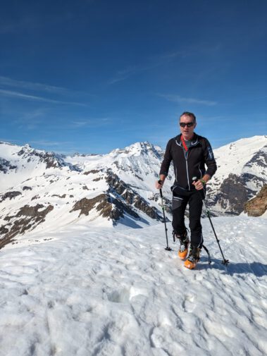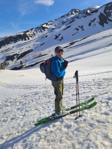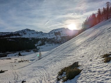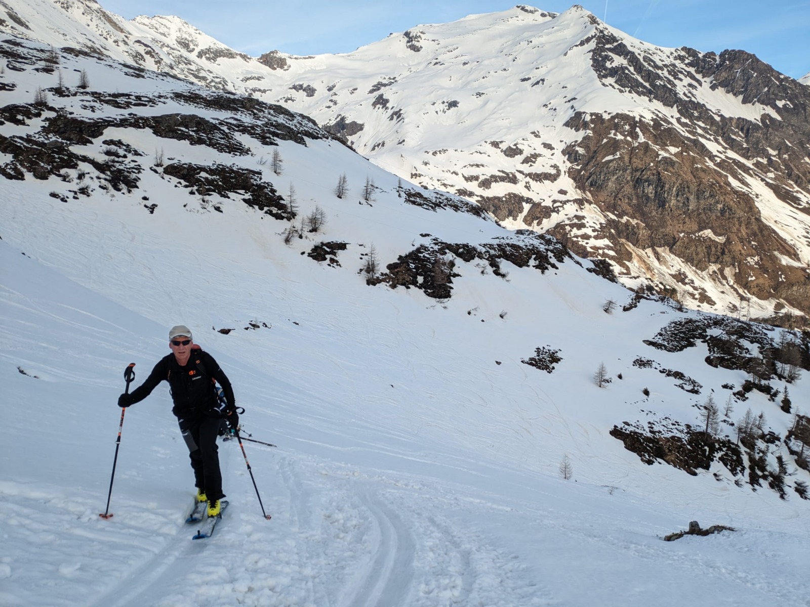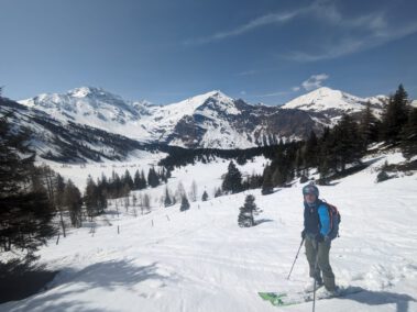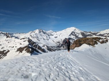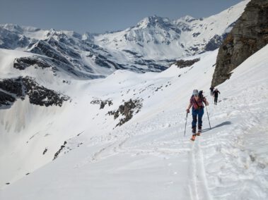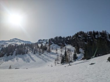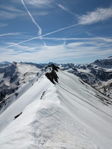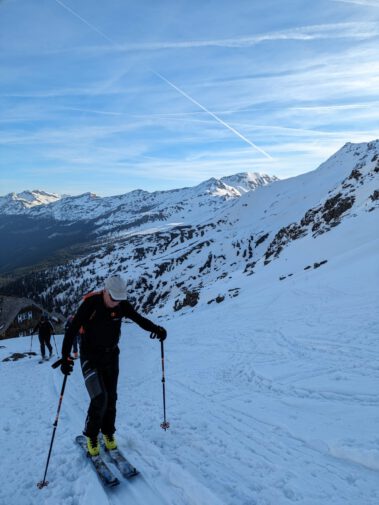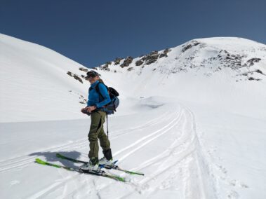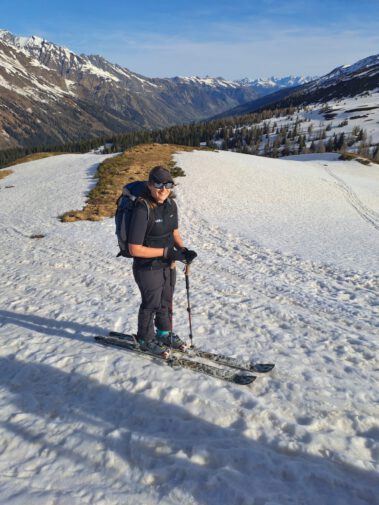 Zur Abfahrt hielt man sich immer rechts hoch und traversiert unterhalb der Goldbergspitze Richtung Herzog Ernst Spitze um den Gegenanstieg zur Rojacher Hütte zu vermeiden. Hier fand man schöne Hänge mit guten Firnverhältnissen vor. Vorbei am Schutzhaus Neubau und durch lichten Lärchenwald ging es rasch abwärts, bis man die letzten 50 Höhenmeter wegen der tageszeitlichen Schneeschmelze die Skier auf den Rucksack schnallen musste. Bereits um 13.30 Uhr erreicht man voller Freude die Sonnenterrasse unserer Unterkunft. Mit Weißbier, Apperol Spritz, Kaffee und Kuchen entspannten und feierten die erfolgreichen Skibergsteiger den erreichten Gipfelklassiker.