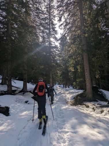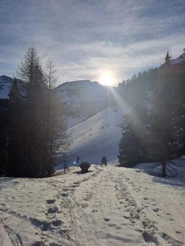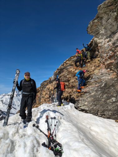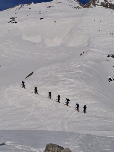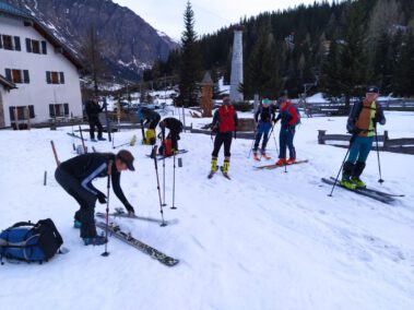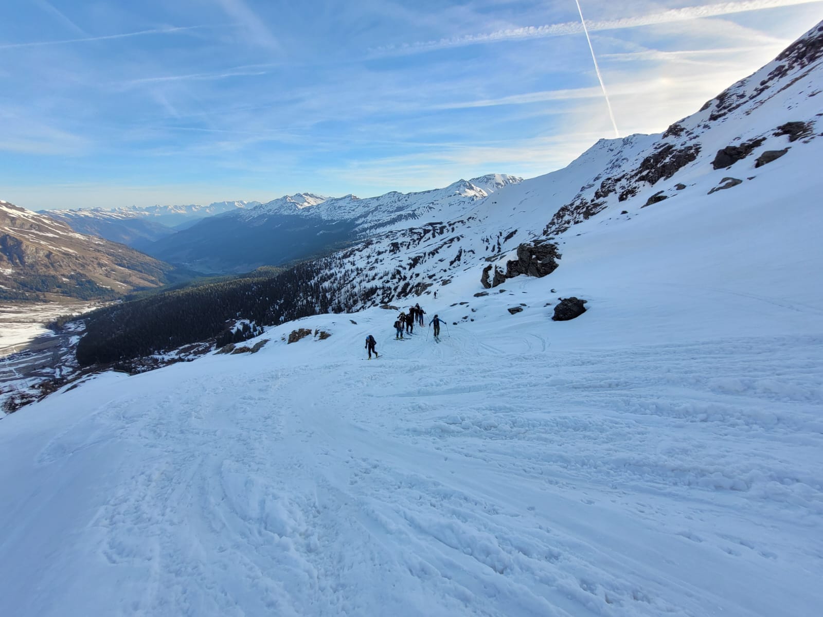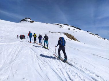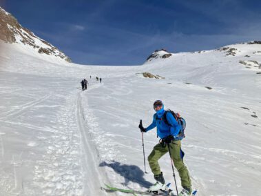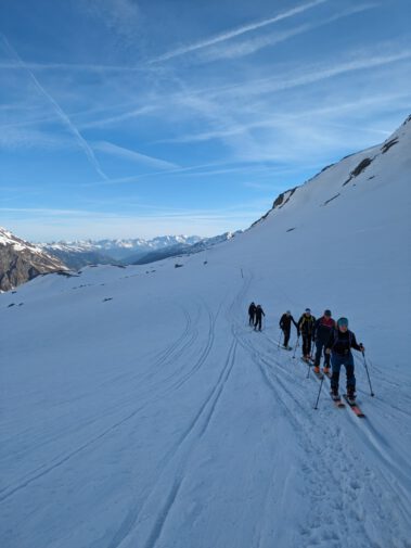 Nachdem der Wetterbericht Sonnenschein pur prognostizierte, die Lawinenwarnstufe immer vormittags mäßiges Risiko verkündete, waren die neun Teilnehmer voller Vorfreude und Skitourenführer Sepp Lurz entspannt.