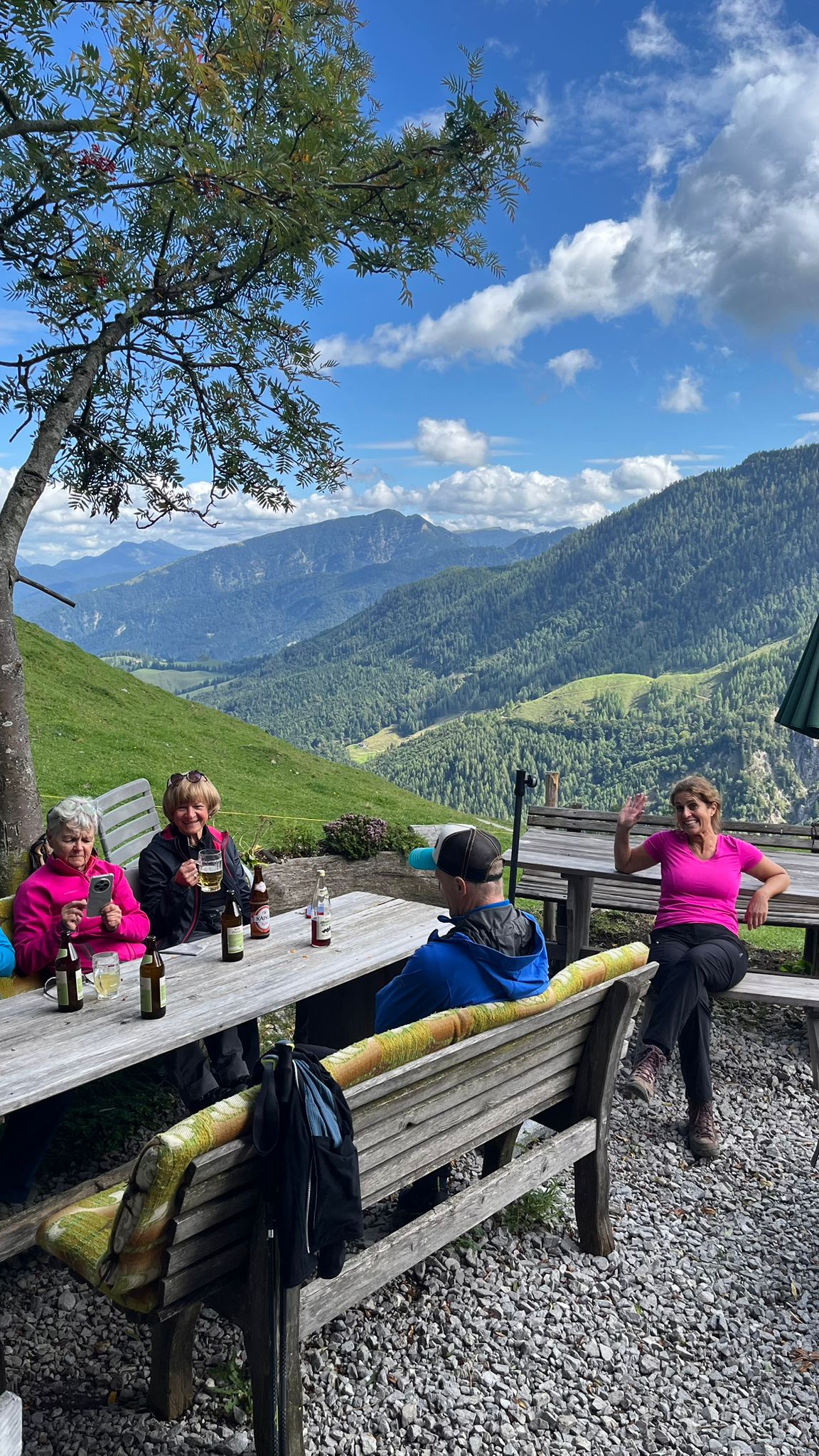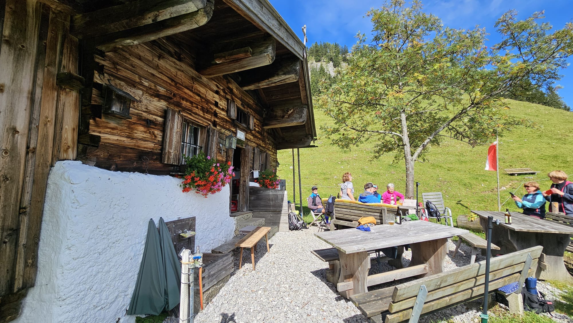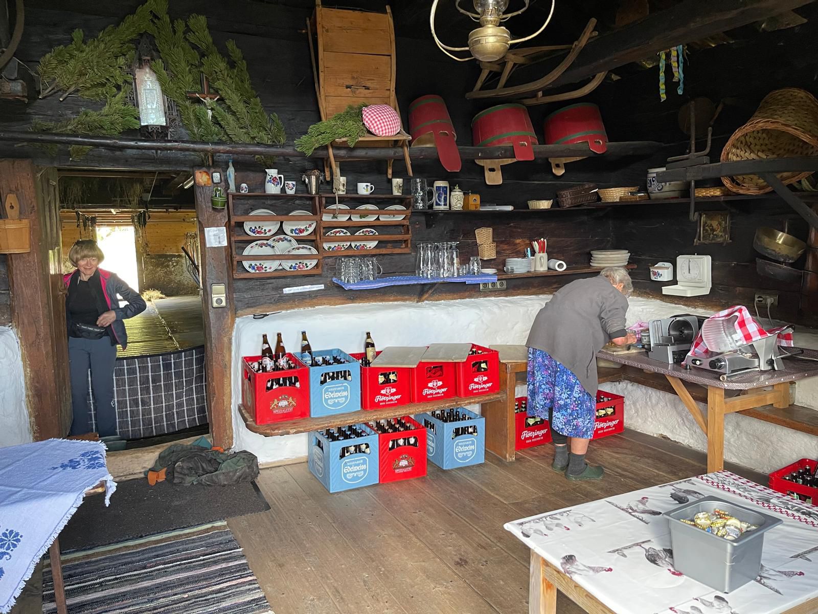 Hier wurden wir von der Sennerin schon herzlich auf der idyllisch gelegenen Sonnenterrasse empfangen. Die Wirtin richtete uns auf großen Brotzeitbrettln leckeren Spezialitäten mit selbstgebackenem Brot und Speck, Bergkäse, Frischkäse her, die wir bis auf den letzten Krümel verputzten.