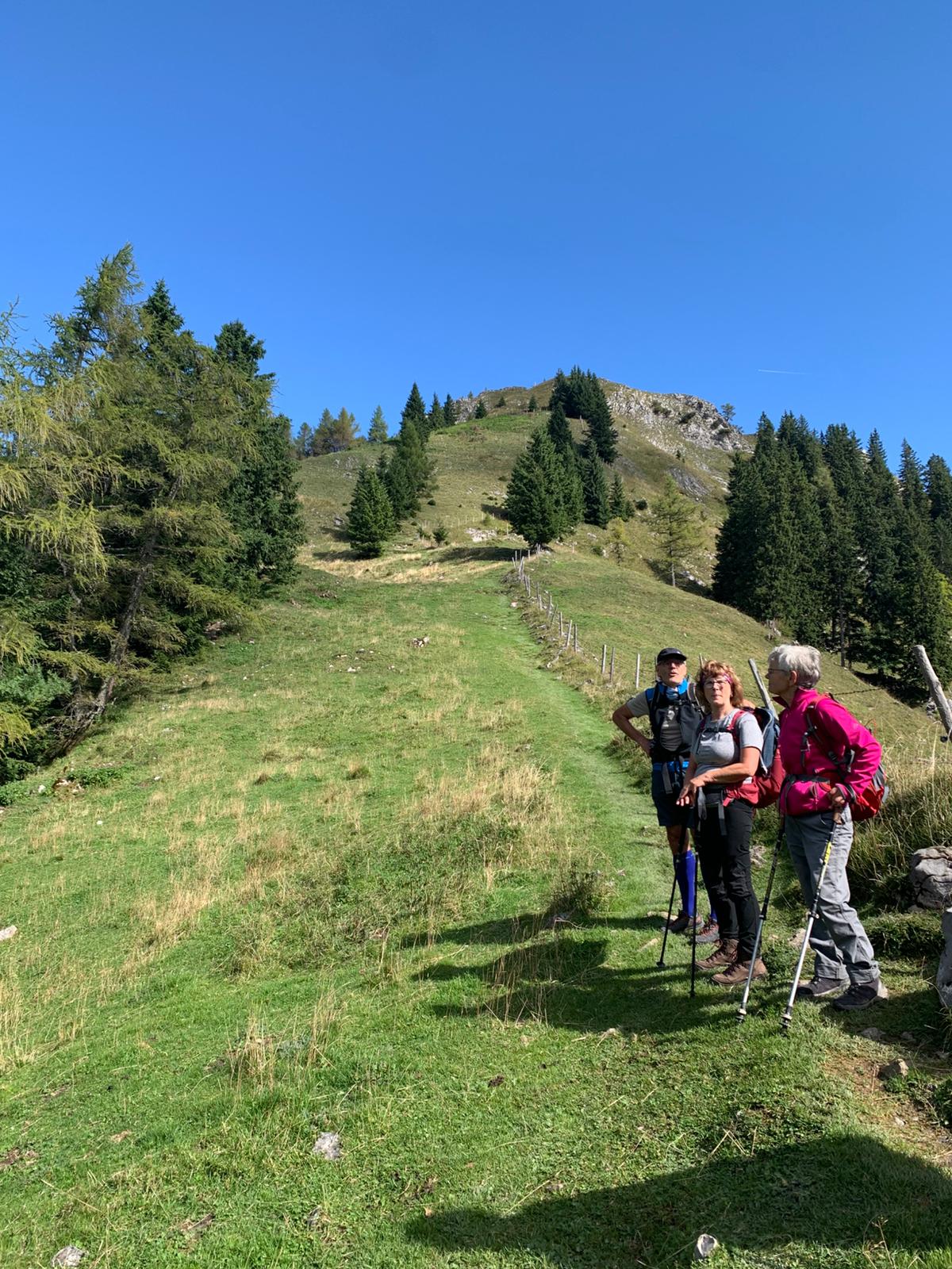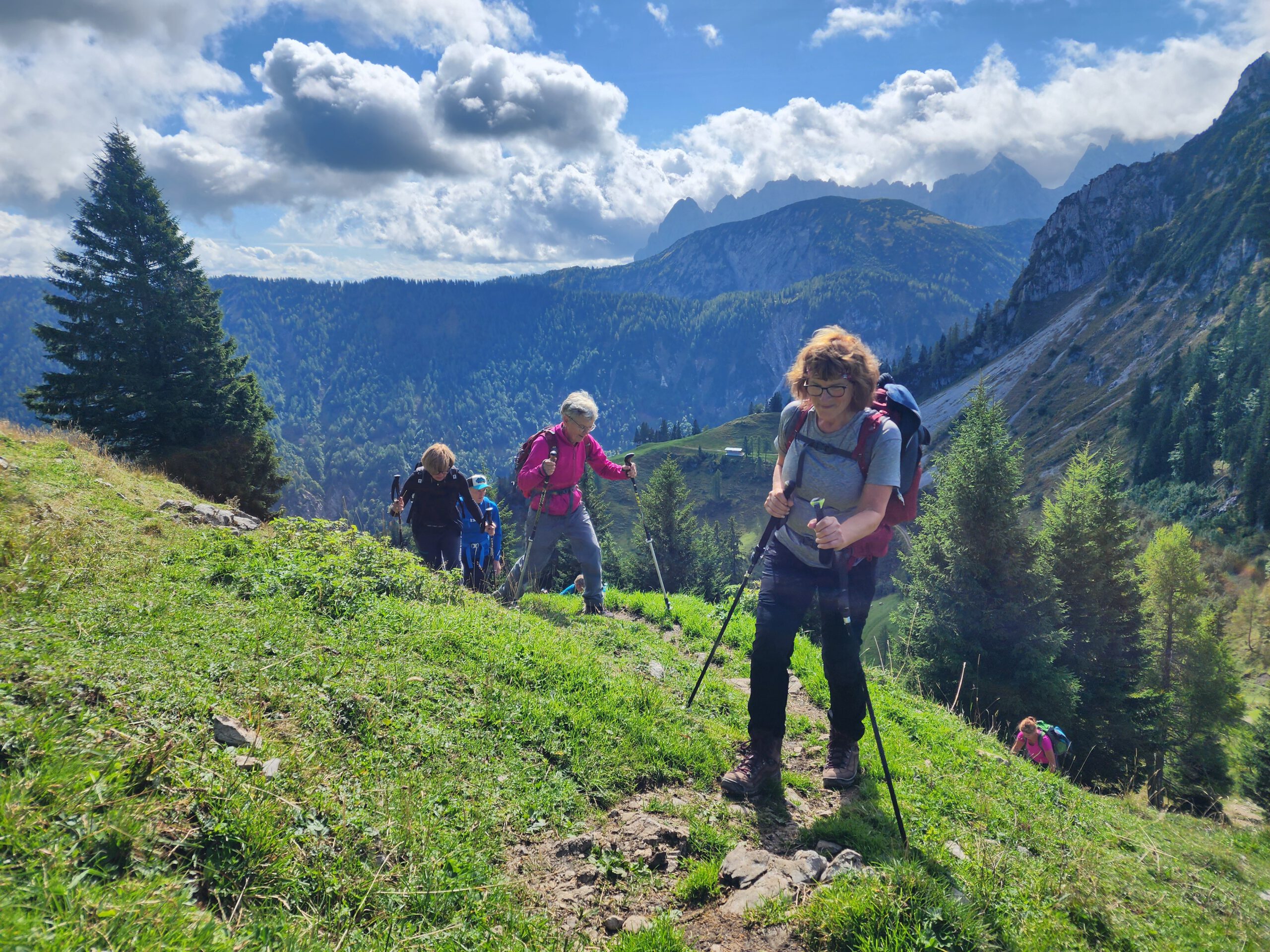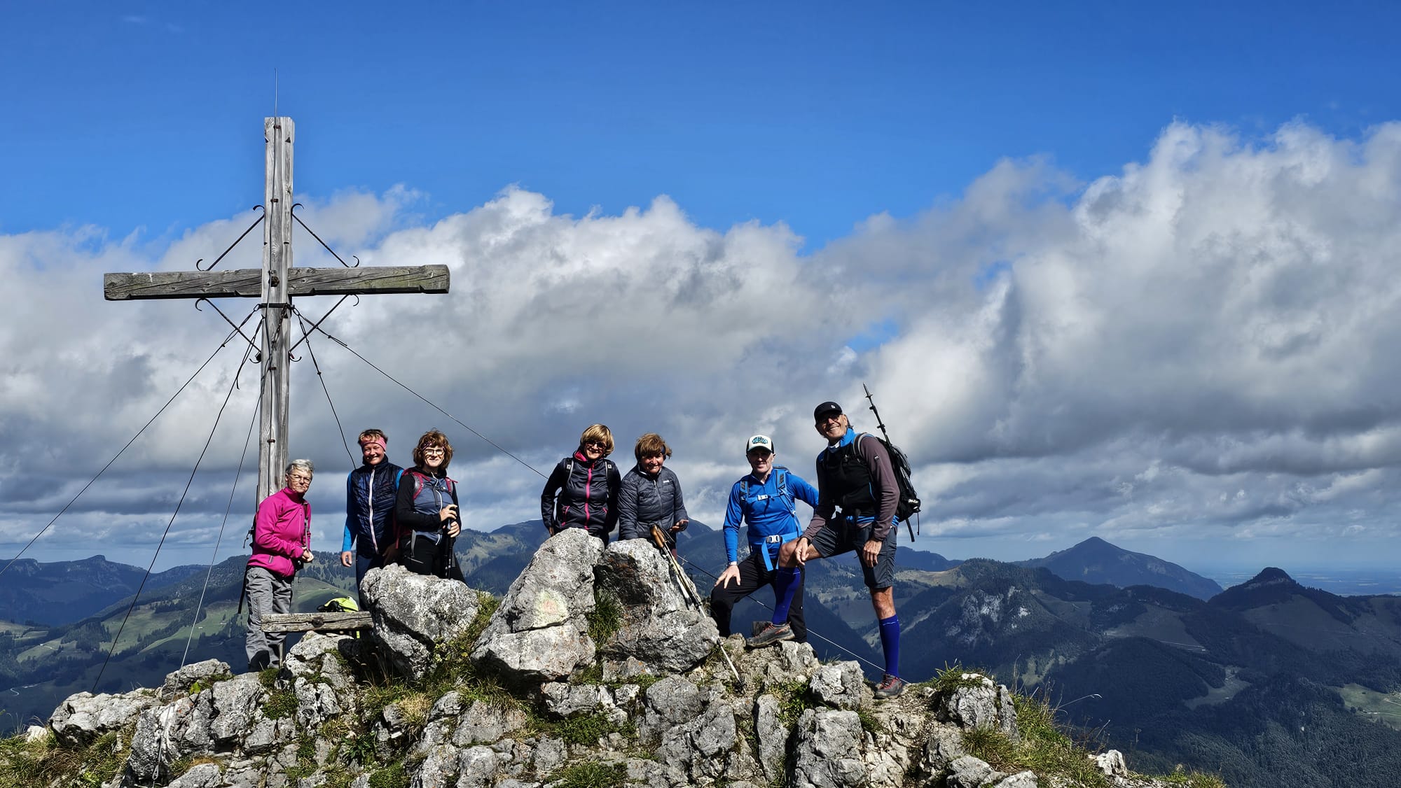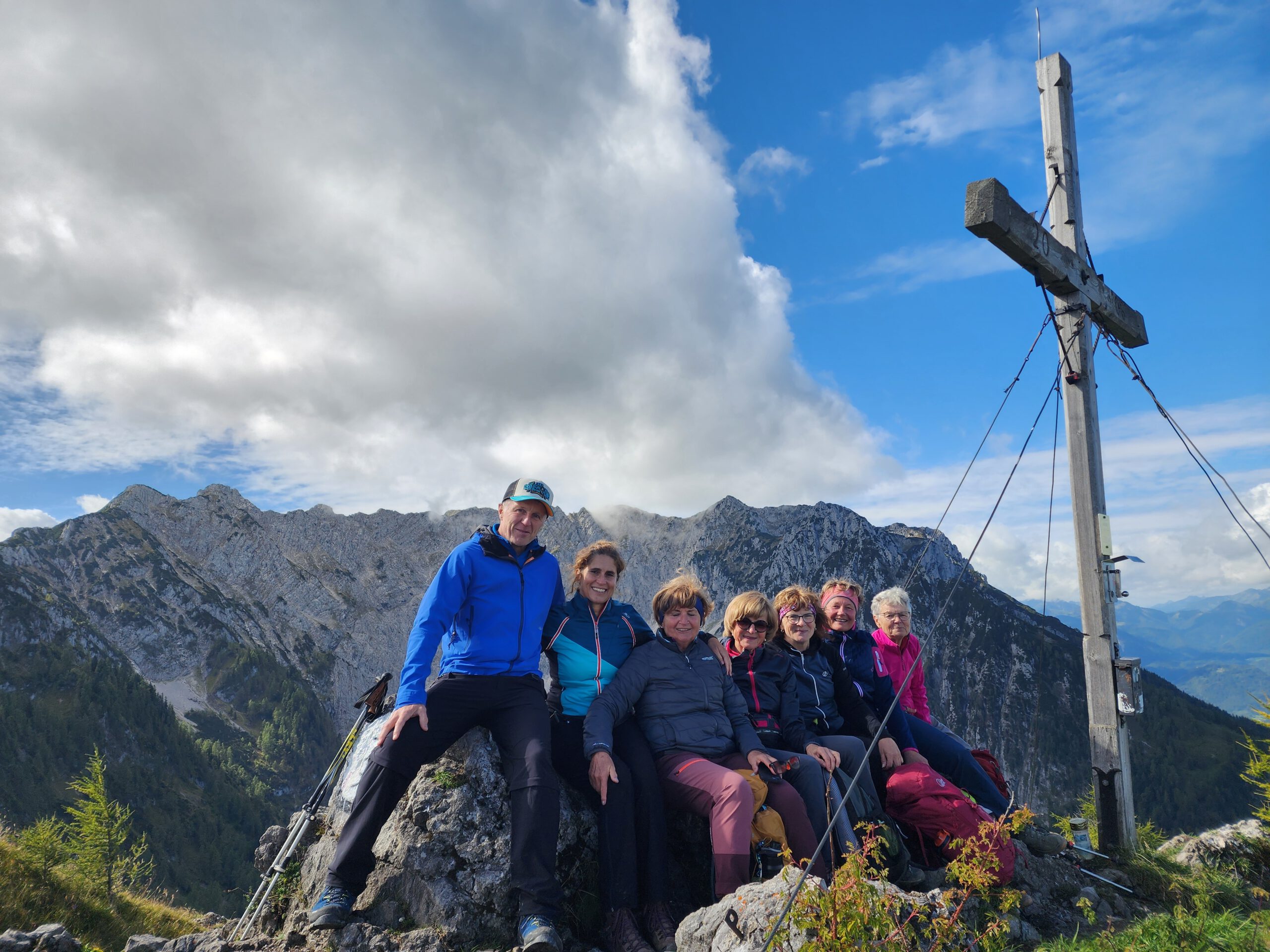 Bei noch locker bewölktem Himmel führte der Steig die Wanderer durch Wald und Wiesenstücke im Wechsel, moderat aufwärts. Je höher man kam desto mehr lichteten sich die Wolken und boten wunderbare Ausblicke auf den Walchsee und die nödlich liegenden Gipfel, Geigelstein, Breitenstein, Wandberg und viele mehr. Nach zwei Stunden erreichte man die Hageralm, die nach der Gipfelbesteigung für die Mittagspause auserwählt wurde. Aber davor mußten noch dreißig Minuten über hellgrüne Wiesen und ein wenig Felsberührung, unschwer zum höchsten Punkt gestiegen werden. In diesem Abschnitt zeigten sich auch Wilder und Zahmer Kaiser sowie das Winklkar im Sonne-Wolkenspiel von ihrer schönsten Seite. Freudestrahlend und Stolz bestaunte man am Gipfelkreuz die Rundumsicht und hielt diese mit den Handykameras fest, bevor es an den Abstieg zur Brotzeitalm ging.