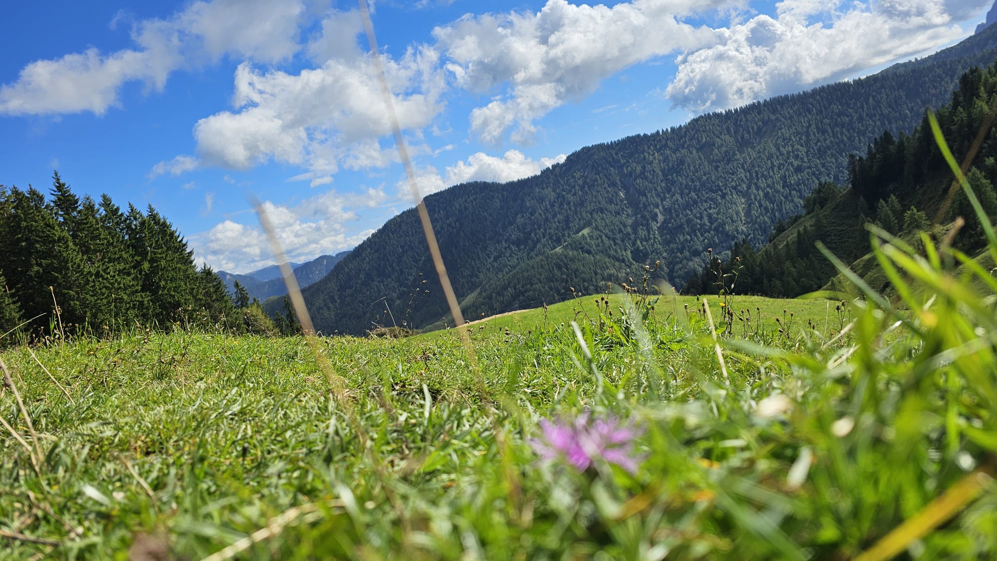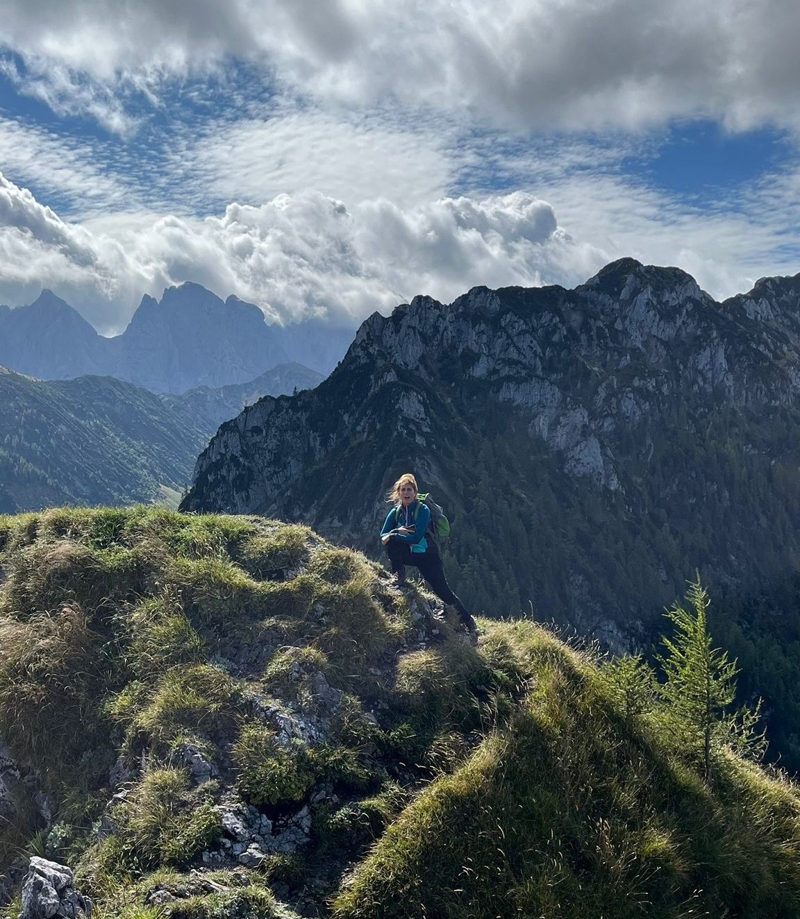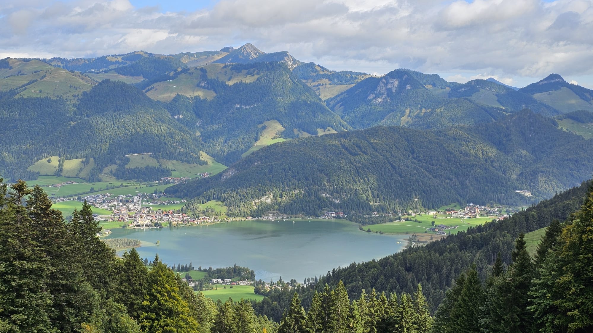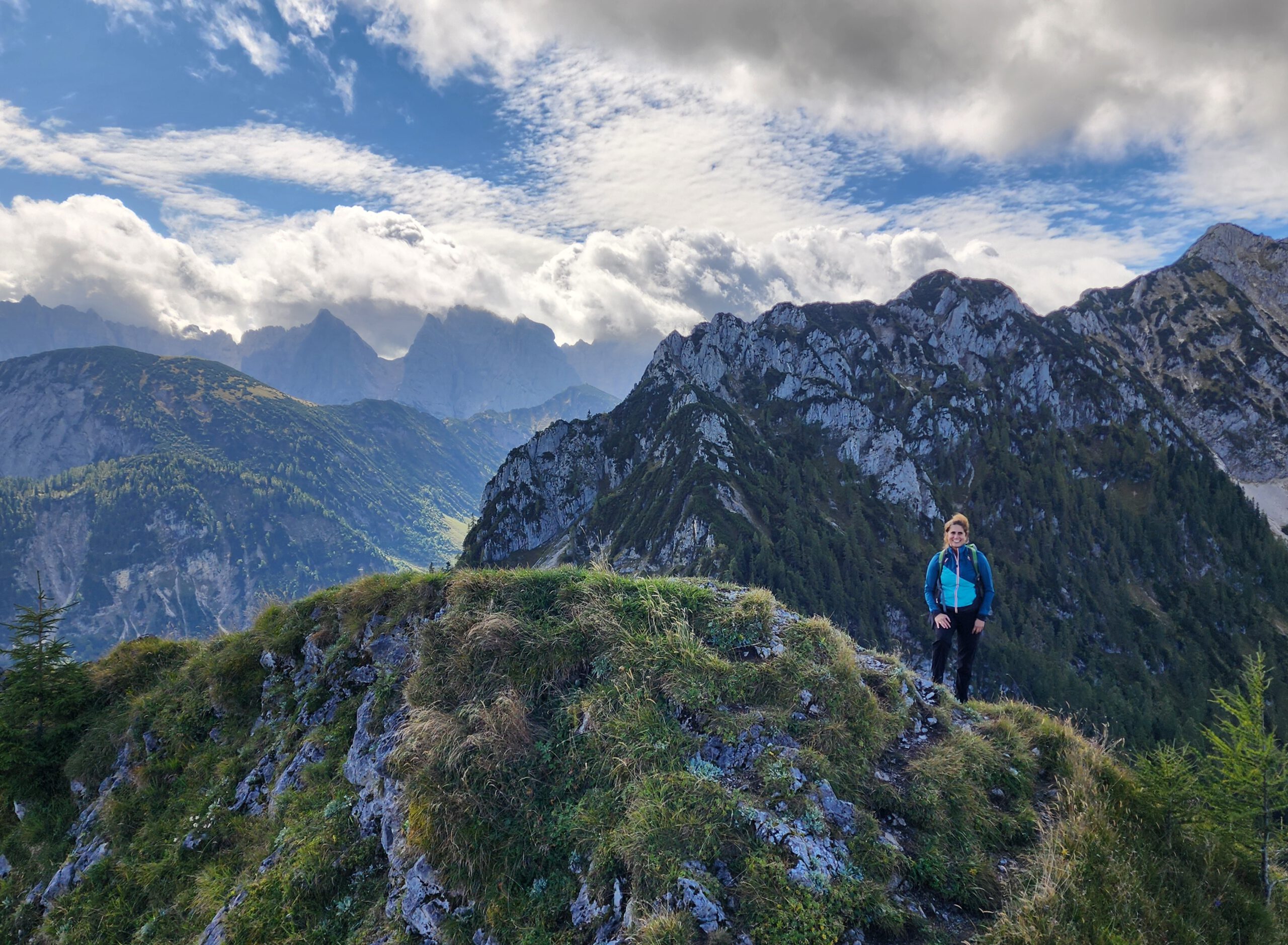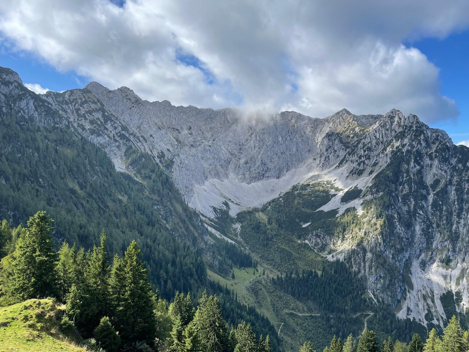 Bei noch locker bewölktem Himmel führte der Steig die Wanderer durch Wald und Wiesenstücke im Wechsel, moderat aufwärts. Je höher man kam desto mehr lichteten sich die Wolken und boten wunderbare Ausblicke auf den Walchsee und die nödlich liegenden Gipfel, Geigelstein, Breitenstein, Wandberg und viele mehr. Nach zwei Stunden erreichte man die Hageralm, die nach der Gipfelbesteigung für die Mittagspause auserwählt wurde. Aber davor mußten noch dreißig Minuten über hellgrüne Wiesen und ein wenig Felsberührung, unschwer zum höchsten Punkt gestiegen werden. In diesem Abschnitt zeigten sich auch Wilder und Zahmer Kaiser sowie das Winklkar im Sonne-Wolkenspiel von ihrer schönsten Seite. Freudestrahlend und Stolz bestaunte man am Gipfelkreuz die Rundumsicht und hielt diese mit den Handykameras fest, bevor es an den Abstieg zur Brotzeitalm ging.